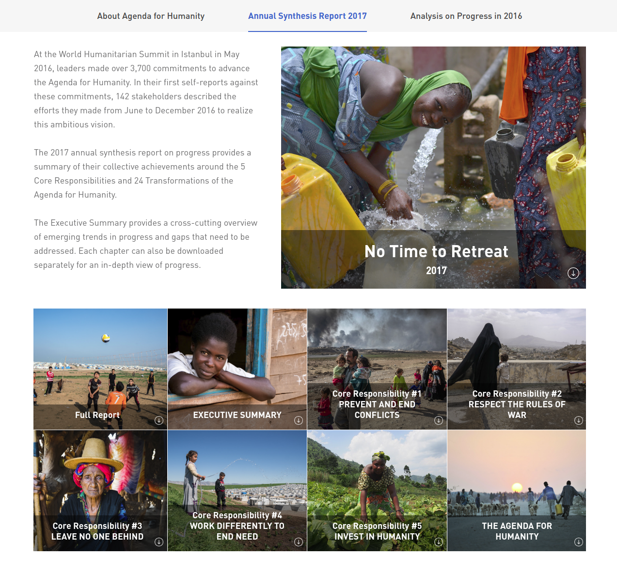 At the World Humanitarian Summit in Istanbul in May 2016, 9,000 representatives from Member States, non-governmental organizations, civil society, people affected by crises, the private sector and international organizations came together and made over 3,700 commitments to deliver on the ambitious changes called for in the Agenda for Humanity. At the request of the Secretary-General, the online Platform for Action, Commitments and Transformations (PACT), was created to house the commitments and provide a hub for transparency, mutual accountability and voluntary progress reporting.